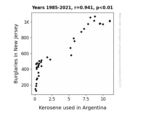 This means 88.6% of the change in the one variable (i.e., Kerosene used in Argentina) is predictable based on the change in the other (i.e., Burglaries in New Jersey) over the 37 years from 1985 through 2021.