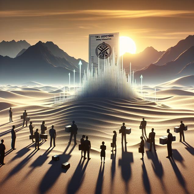 Prompt: [Symbolism] In the vast desert of Nevada, a group of tax examiners and collectors are depicted in silhouette against the setting sun, surrounded by towering stacks of papers adorned with the iconic logo of Petróleo Brasileiro S.A. - Petrobras. As the examiners meticulously pore over the documents, their numbers gradually dwindle, with some disappearing into the swirling sands. In the distance, the fluctuating stock price chart of Petrobras emerges, appearing as an ethereal, translucent mirage that visibly dips as the number of examiners diminishes, symbolizing the profound impact of reduced scrutiny on the company's financial standing. The depiction should include only scenes, people, and objects, it should not include text or speech bubbles.