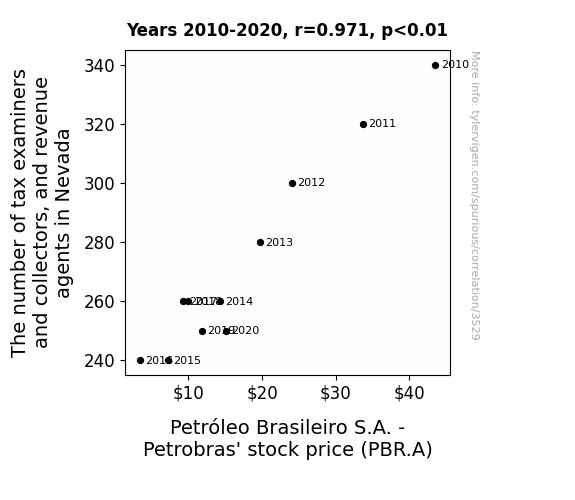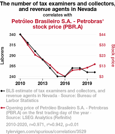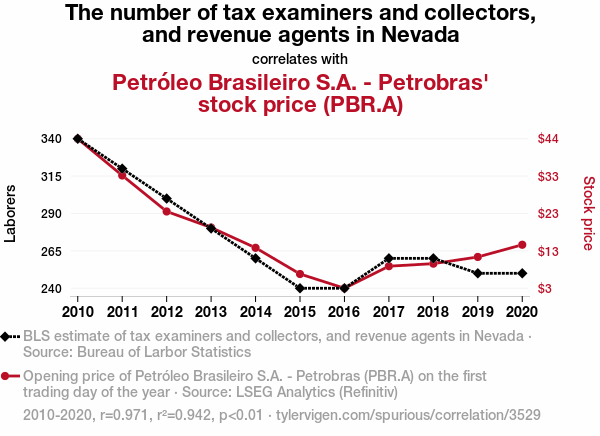 Bear in mind that correlation does not imply causation, but in this case, the correlation is so strong that one might be tempted to ask, "Are the tax examiners and collectors in Nevada secretly pulling the strings of Petrobras' stock price, or are they just really good at spotting valuable stocks?"