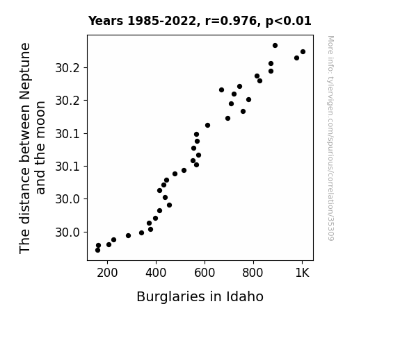 This means 95.2% of the change in the one variable (i.e., Burglaries in Idaho) is predictable based on the change in the other (i.e., The distance between Neptune and the moon) over the 38 years from 1985 through 2022.