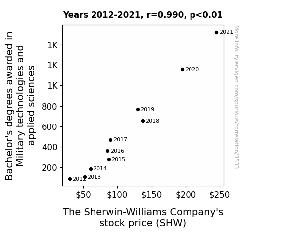 To investigate the potentially colorful relationship between the number of Bachelor's degrees awarded in Military technologies and applied sciences and the stock price of The Sherwin-Williams Company (SHW), this study employed a mix of traditional statistical analysis and a sprinkle of military-grade precision. After all, when it comes to uncovering such unexpected connections, you need more than just a thin coat of analysis. Our data sources primarily included the National Center for Education Statistics and the robust analytics of LSEG Analytics (Refinitiv), providing us with a comprehensive palette of information from 2012 to 2021.
