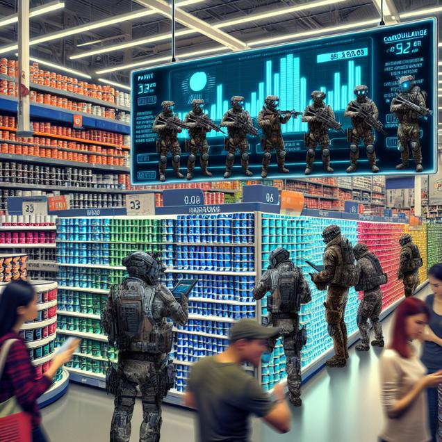 User prompt: Please respond with an image generation prompt that would be likely to create an interesting visual using DALLE-3, using the following style: [ Futuristic ] and depicting this scene: In a hardware store, a group of individuals with Bachelor's degrees in Military technologies and applied sciences are seamlessly blending in with the paint section, using their camouflage tactics to listen in on conversations about painting projects. Meanwhile, the stock price of The Sherwin-Williams Company (SHW) is displayed on a screen right above them, showing a significant surge in value. Keep the visual depiction simple. Do not include any words or speech bubbles.