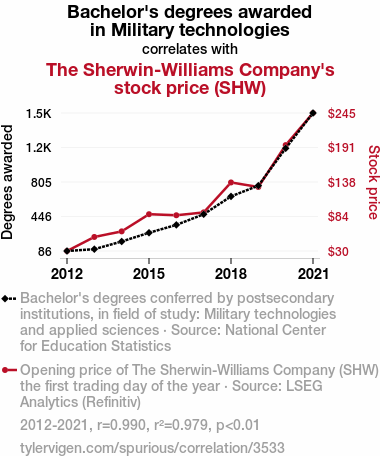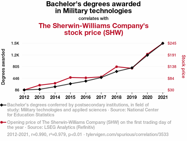 To investigate the potentially colorful relationship between the number of Bachelor's degrees awarded in Military technologies and applied sciences and the stock price of The Sherwin-Williams Company (SHW), this study employed a mix of traditional statistical analysis and a sprinkle of military-grade precision. After all, when it comes to uncovering such unexpected connections, you need more than just a thin coat of analysis. Our data sources primarily included the National Center for Education Statistics and the robust analytics of LSEG Analytics (Refinitiv), providing us with a comprehensive palette of information from 2012 to 2021.
