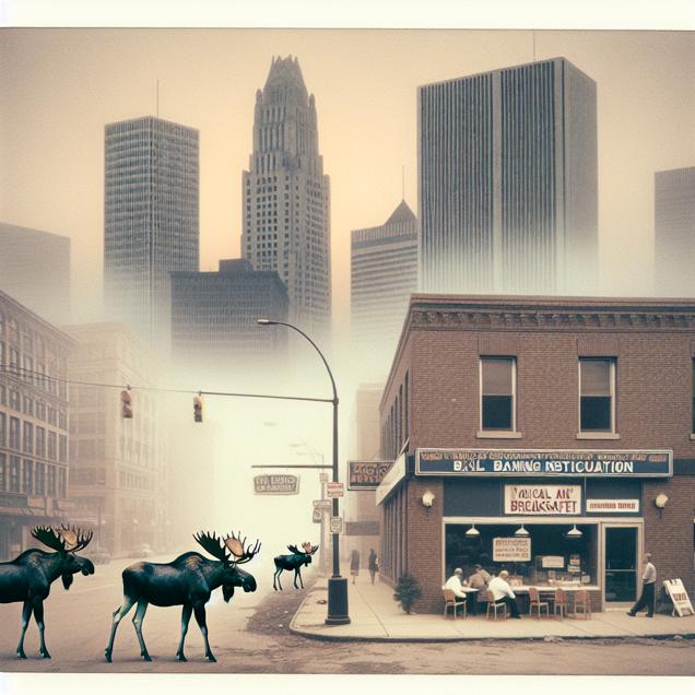 ChatGPT: Generate an image in the style of a Polaroid photo: In the center, depict a cityscape of Buffalo, with a thick smog hanging in the air. Among the city streets, include moose roaming, looking displaced and seeking shelter. In the foreground, show a local breakfast spot with a noticeable lack of maple syrup, leading to a disrupted morning routine. In the background, portray a building representing Banco Santander, with employees looking sluggish and unfocused. Let the overall atmosphere of the image convey a sense of disruption and unease.