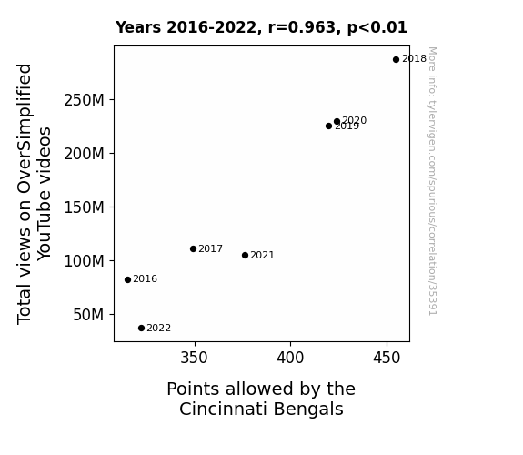 This means 92.8% of the change in the one variable (i.e., Points allowed by the Cincinnati Bengals) is predictable based on the change in the other (i.e., Total views on OverSimplified YouTube videos) over the 7 years from 2016 through 2022.