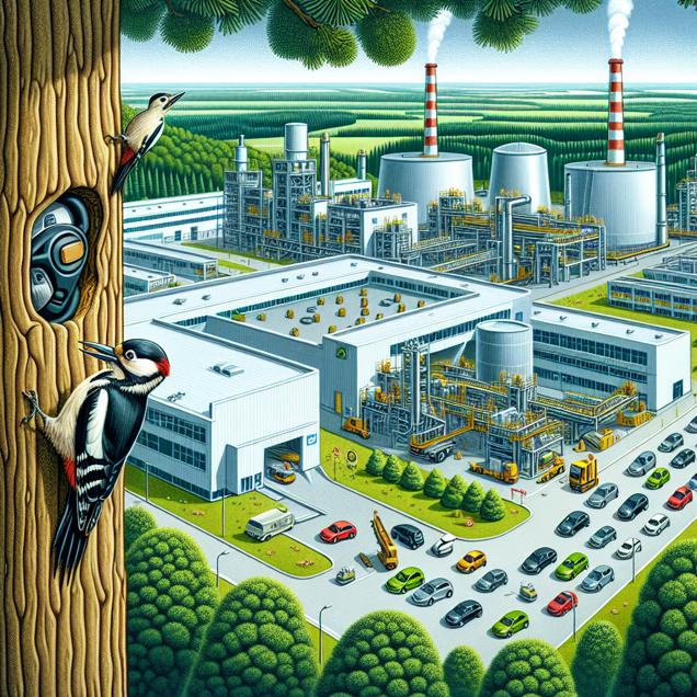 ChatGPT: Prompt: Generate an image of a car manufacturing factory in Romania surrounded by a dense, lush forest, with a large biomass power plant in the distance. In the foreground, there is a line of cars being recalled due to airbag issues, with woodpeckers perched on the airbags, mistaking them for tree hollows and pecking at them. Smoke rises from the power plant as it generates electricity from biomass. Use a high-tech visual style with sleek, modern buildings and advanced industrial machinery.