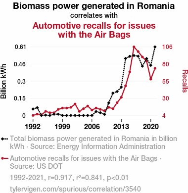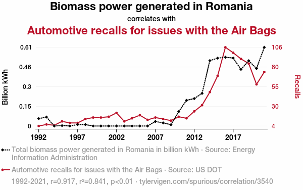 - The spurious research paper: Burning Biomass, Bagging Recalls: A Predictive Correlation Analysis of Biomass Power Generation in Romania and Automotive Air Bag Recalls in the US