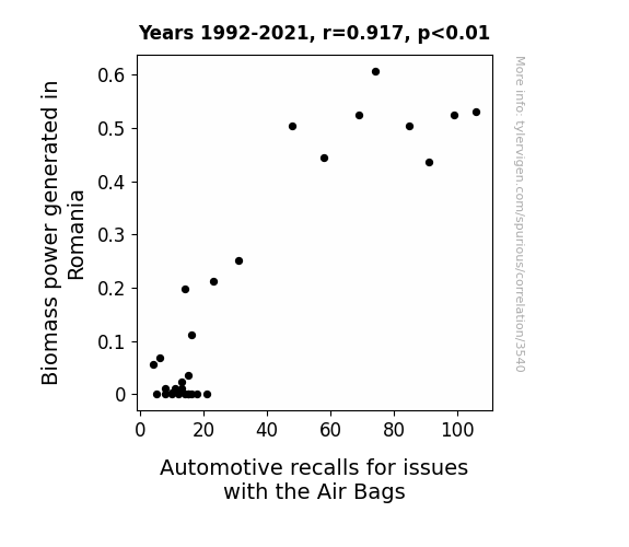 The results of our study reveal a striking correlation between Biomass power generation in Romania and Automotive recalls for issues related to air bags in the US. During the period from 1992 to 2021, we found a correlation coefficient of 0.9170793, indicating a remarkably strong relationship between these two seemingly unrelated variables. The coefficient of determination (r-squared) of 0.8410345 further emphasizes the robustness of this connection.