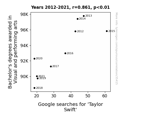 This means 74.1% of the change in the one variable (i.e., Google searches for 'Taylor Swift') is predictable based on the change in the other (i.e., Bachelor's degrees awarded in Visual and performing arts) over the 10 years from 2012 through 2021.