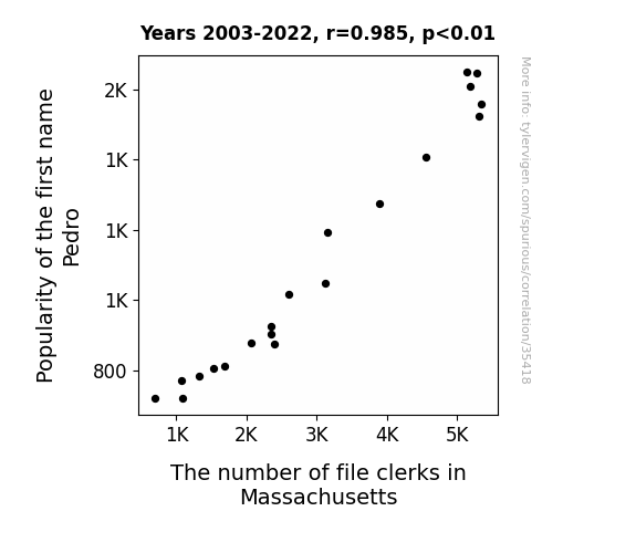 This means 97.1% of the change in the one variable (i.e., The number of file clerks in Massachusetts) is predictable based on the change in the other (i.e., Popularity of the first name Pedro) over the 20 years from 2003 through 2022.