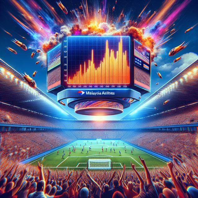 Prompt: Title: Super Bowl Shockwave Generate an image showing a dynamic scene of a football stadium with a larger-than-life scoreboard, displaying the widening point difference between the two teams. Beneath the scoreboard, visualize a bar chart representing the surge in Google searches for "Malaysia Airlines" following the game's progression. The bar chart should sharply ascend, indicating the synchronized increase in online searches. The overall image should have a lively and vivid energy, capturing the intensity of the Super Bowl and its impact on digital activity. The depiction should include only scenes, people, and objects, it should not include text or speech bubbles.