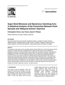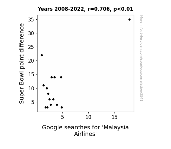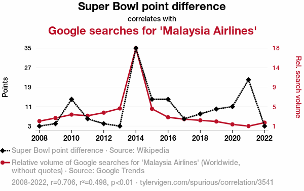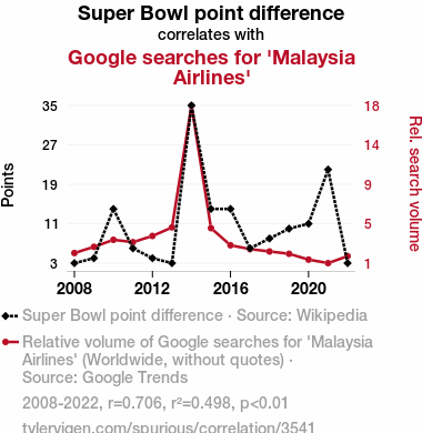 - The spurious research paper: Super Bowl Blowouts and Mysterious Vanishing Acts: A Statistical Analysis of the Connection Between Point Spreads and 'Malaysia Airlines' Searches