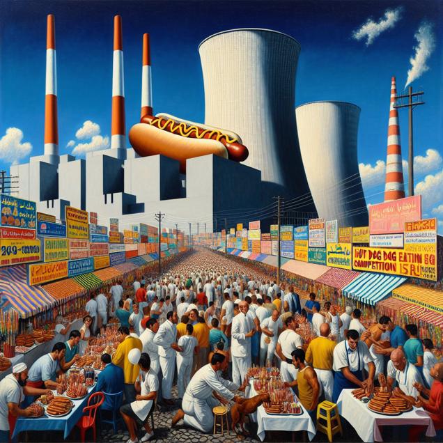 ChatGPT: In a bustling city in Brazil, a sleek nuclear power plant stands tall against the bright blue sky. Rows of hotdog stands line the streets, with vibrant banners showcasing the "Nathan's Hot Dog Eating Competition Champion." A crowd gathers to watch as the champion, fueled by the atomic energy of the nuclear power, triumphantly devours a towering stack of hotdogs in a dazzling display of "nuclear" dog consumption.