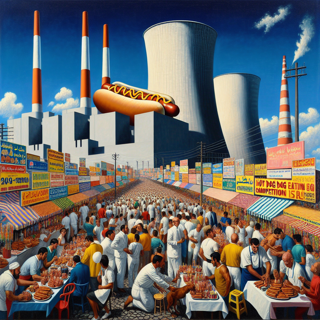 User prompt: Please describe a visual scene that prominently depicts both Nuclear power generation in Brazil and Hotdogs consumed by Nathan's Hot Dog Eating Competition Champion, in the following situation: As nuclear power in Brazil increased, so did the "atomic" energy of hotdogs, inspiring the Nathan's champion to consume more in a "chain reaction" of frankfurter feasting frenzy. The power of "nuclear" dogs knows no limits!. Keep the description simple.