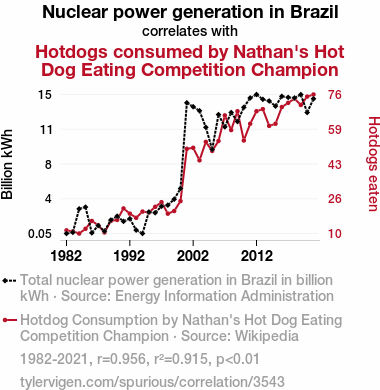 A linear line chart with years as the X-axis and two variables on the Y-axis. The first variable is Nuclear power generation in Brazil and the second variable is Hotdogs consumed by Nathan's Hot Dog Eating Competition Champion.  The chart goes from 1982 to 2021, and the two variables track closely in value over that time. Small Image