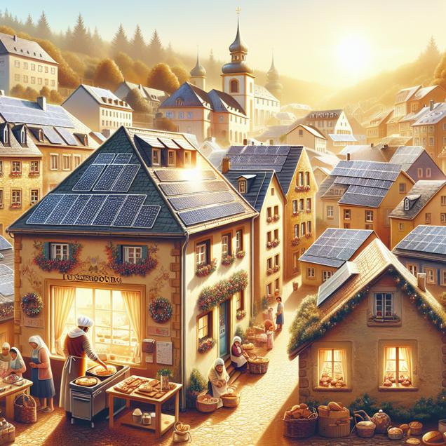 User prompt: Please describe a visual scene that prominently depicts both Butter consumption and Solar power generated in Luxembourg, in the following situation: Because as butter consumption increased, more people turned to baking at home which led to a rise in solar power usage to offset the energy consumption from all the ovens. The reflection of sunlight off all the buttery surfaces in the country also increased the efficiency of solar panels, creating a deliciously efficient cycle of renewable energy.. Keep the description simple.