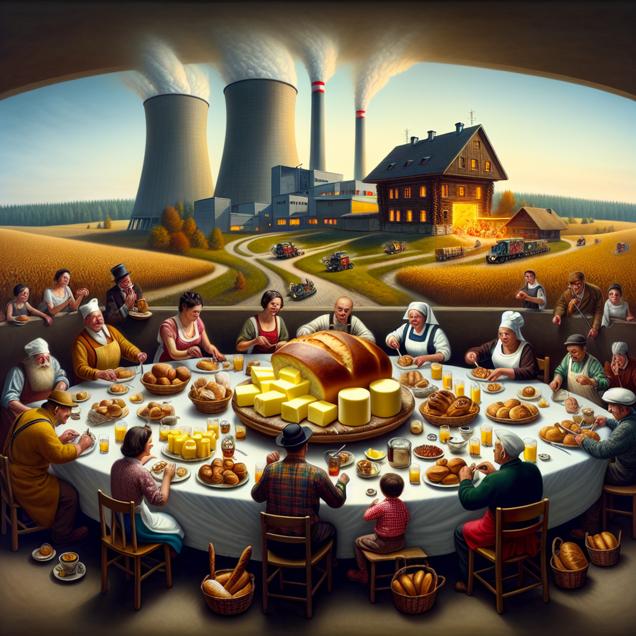ChatGPT: [ Symbolism ] Create an image of a charming Polish countryside with a traditional kitchen table at the center. The table should be overflowing with freshly baked bread and a generous amount of butter, symbolizing abundance and indulgence. Surrounding the table should be people of various ages and backgrounds, visibly enjoying their buttery treats, symbolizing unity and pleasure in the simple things. In the background, a modern biomass power plant should be depicted, hummings with activity, symbolizing progress and innovation. Show the energy visibly rising as the people consume the buttery treats, symbolizing the connection between butter consumption and the generation of energy in Poland. Capture the unexpected connection in a visually striking and thought-provoking manner.