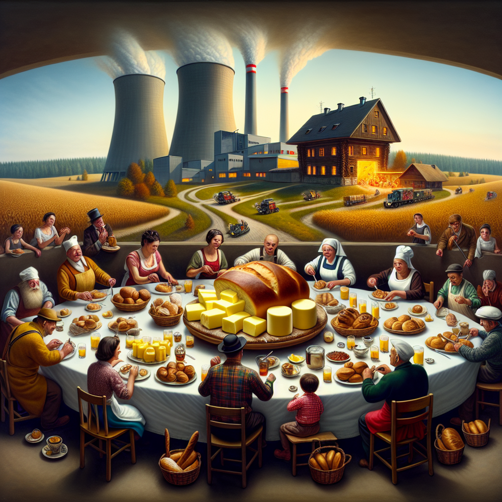 Prompt: [ Symbolism ] Create an image of a charming Polish countryside with a traditional kitchen table at the center. The table should be overflowing with freshly baked bread and a generous amount of butter, symbolizing abundance and indulgence. Surrounding the table should be people of various ages and backgrounds, visibly enjoying their buttery treats, symbolizing unity and pleasure in the simple things. In the background, a modern biomass power plant should be depicted, hummings with activity, symbolizing progress and innovation. Show the energy visibly rising as the people consume the buttery treats, symbolizing the connection between butter consumption and the generation of energy in Poland. Capture the unexpected connection in a visually striking and thought-provoking manner. The depiction should include only scenes, people, and objects, it should not include text or speech bubbles.
