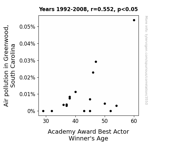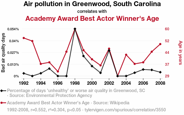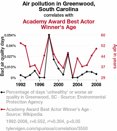- The spurious research paper: Breathing in the Oscar Race: The Curious Link Between Air Quality in Greenwood, South Carolina, and Best Actor Winners' Golden Ages
