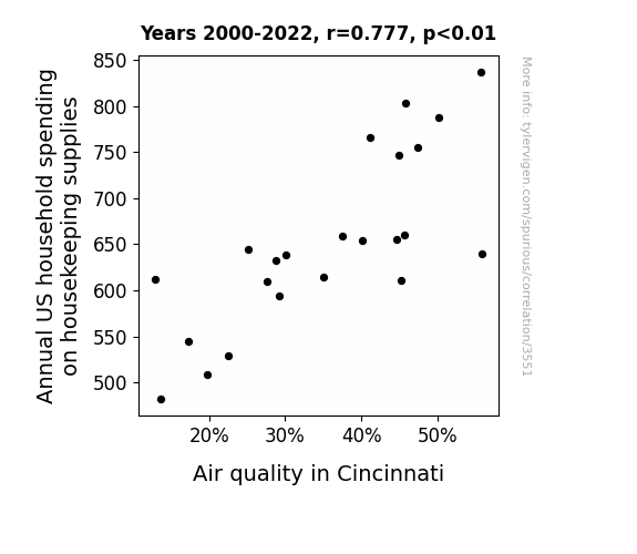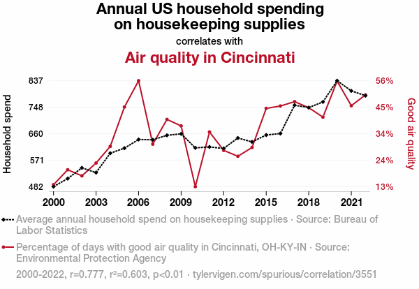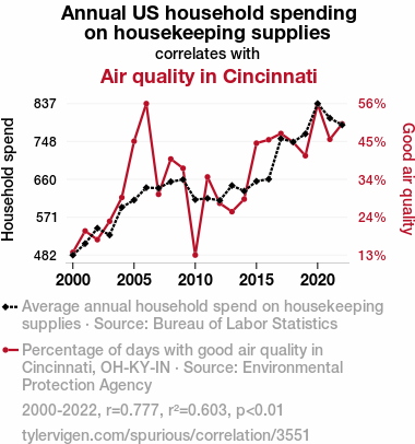 - The spurious research paper: Dusting Off the Facts: Examining the Link Between Annual US Household Spending on Housekeeping Supplies and Air Quality in Cincinnati