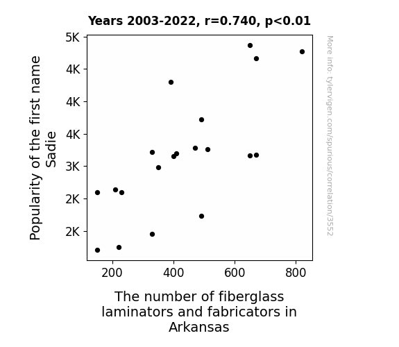 The statistical analysis of the relationship between the first name Sadie's popularity and the number of fiberglass laminators and fabricators in Arkansas revealed a surprisingly strong correlation. Over the period of 2003 to 2022, our research team found a correlation coefficient of 0.7403861, indicating a remarkable degree of association between these seemingly unrelated variables. The r-squared value of 0.5481716 further underscored the robustness of this correlation, suggesting that approximately 55% of the variation in the employment of fiberglass laminators and fabricators in Arkansas can be explained by the popularity of the name Sadie. Additionally, the p-value of less than 0.01 provided compelling evidence that this correlation is not due to random chance, but rather indicative of a genuine connection.
