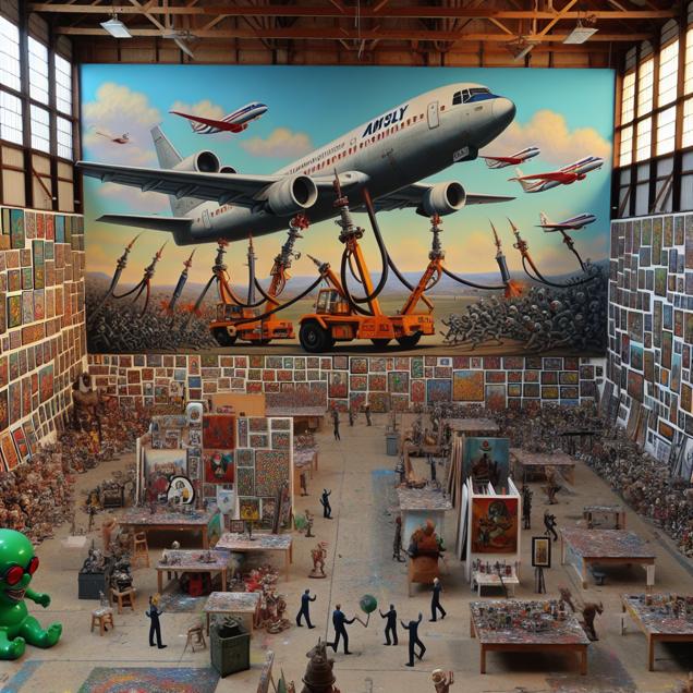 Prompt: Generate an image of an oversized canvas with a humorous depiction of a jet aircraft being filled up with jet fuel, while canvases and sculptures fill a bustling Pennsylvania art studio. The scene should have a comical and imaginative style that you would see on Reddit, with a touch of surrealism. The depiction should include only scenes, people, and objects, it should not include text or speech bubbles.