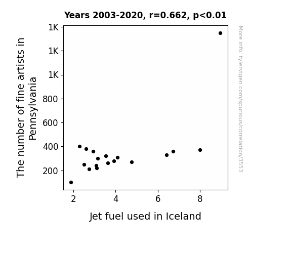 ChatGPT: In a bustling Pennsylvania art studio, the number of fine artists steadily increases, with canvases and sculptures filling the space. Meanwhile, at an airport in Iceland, a plane is being fueled up with jet fuel before taking off for Pennsylvania. The fuel gauge ticks up as the demand for avant-garde Icelandic art leads to more frequent flights, reflecting the increased jet fuel usage.