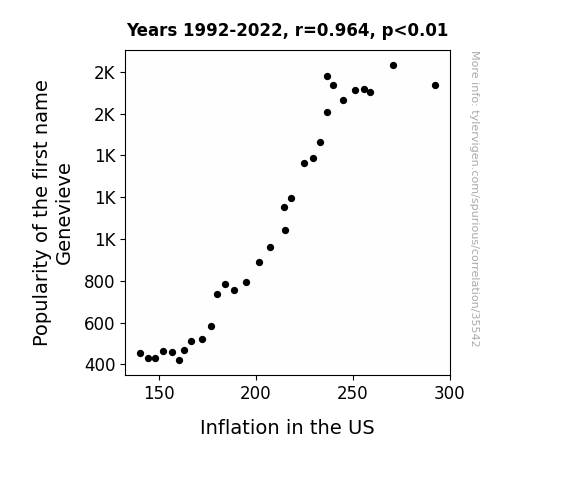 This means 92.9% of the change in the one variable (i.e., Inflation in the US) is predictable based on the change in the other (i.e., Popularity of the first name Genevieve) over the 31 years from 1992 through 2022.