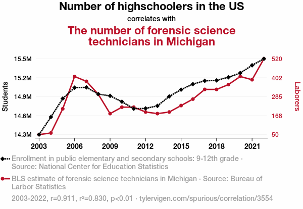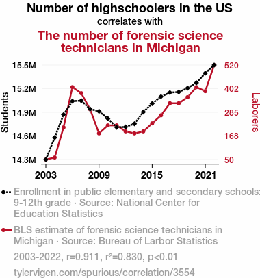 This means 83% of the change in the one variable (i.e., The number of forensic science technicians in Michigan) is predictable based on the change in the other (i.e., Number of highschoolers in the US) over the 20 years from 2003 through 2022.
