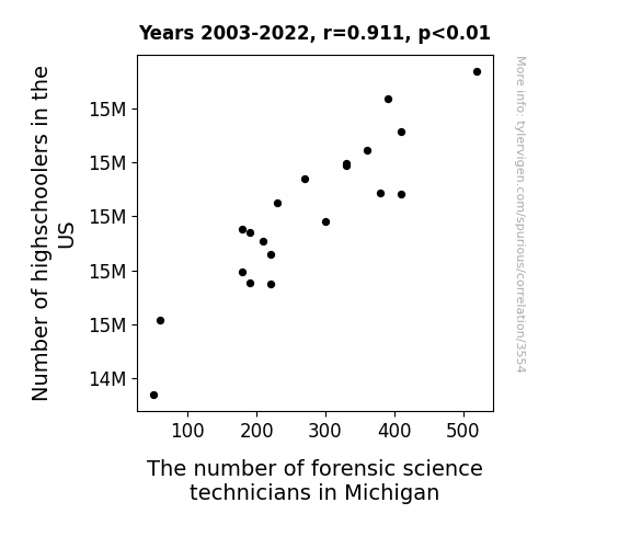 The examination of data spanning from 2003 to 2022 from the National Center for Education Statistics and the Bureau of Labor Statistics revealed a remarkably strong correlation between the number of high schoolers in the United States and the number of forensic science technicians in Michigan. The correlation coefficient of 0.9107945 and r-squared of 0.8295467 indicate a robust statistical association (p < 0.01) between these seemingly unrelated variables.