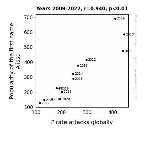 This means 88.3% of the change in the one variable (i.e., Pirate attacks globally) is predictable based on the change in the other (i.e., Popularity of the first name Alissa) over the 14 years from 2009 through 2022.