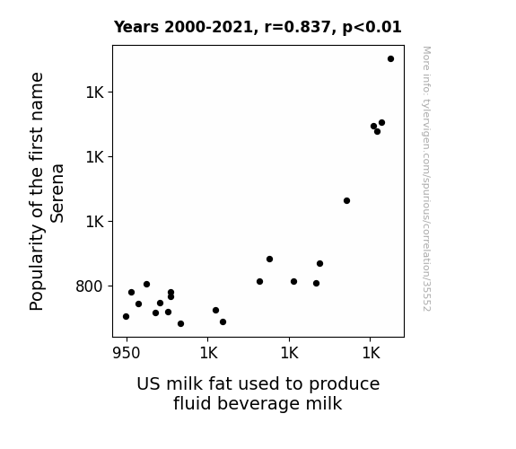 This means 70% of the change in the one variable (i.e., US milk fat used to produce fluid beverage milk) is predictable based on the change in the other (i.e., Popularity of the first name Serena) over the 22 years from 2000 through 2021.