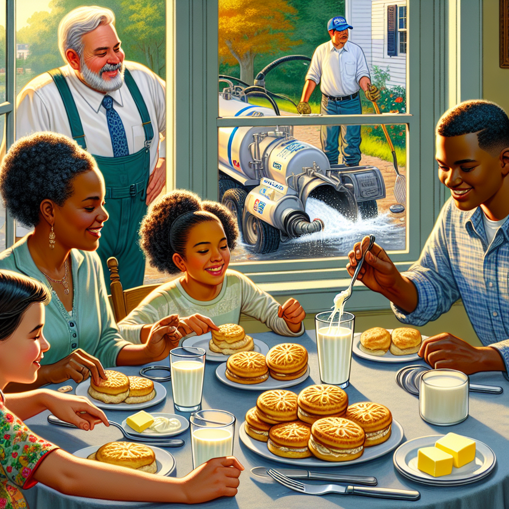 User prompt: Please respond with an image generation prompt that would be likely to create an interesting visual using DALLE-3, using the following style: [ A Discovery magazine cover image ] and depicting this scene: In a cozy kitchen in Virginia, a family is gathered around the breakfast table enjoying freshly-baked biscuits slathered in rich, creamy butter. As they savor the delicious meal, a buttery fingerprint is left on the glass of milk, and soon after, a slippery buttered knife slips from a hand, falling into the kitchen sink. Outside, a septic tank servicer and sewer pipe cleaner are seen working diligently, clearing clogs caused by dropped buttery items. Keep the visual depiction simple. Do not include any words or speech bubbles.