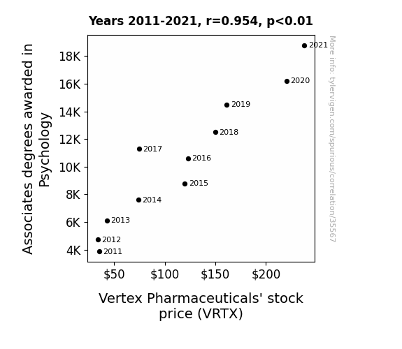 This means 90.9% of the change in the one variable (i.e., Vertex Pharmaceuticals' stock price (VRTX)) is predictable based on the change in the other (i.e., Associates degrees awarded in Psychology) over the 11 years from 2011 through 2021.