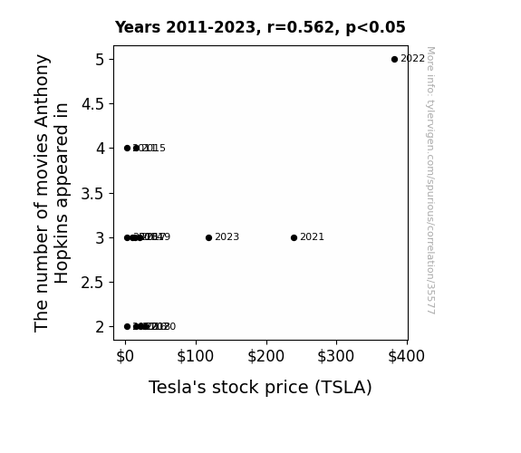 This means 31.6% of the change in the one variable (i.e., Tesla's stock price (TSLA)) is predictable based on the change in the other (i.e., The number of movies Anthony Hopkins appeared in) over the 13 years from 2011 through 2023.