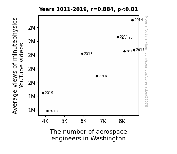 This means 78.2% of the change in the one variable (i.e., The number of aerospace engineers in Washington) is predictable based on the change in the other (i.e., Average views of minutephysics YouTube videos) over the 9 years from 2011 through 2019.