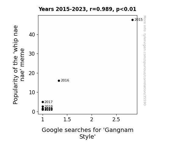 This means 97.7% of the change in the one variable (i.e., Google searches for 'Gangnam Style') is predictable based on the change in the other (i.e., Popularity of the 'whip nae nae' meme) over the 9 years from 2015 through 2023.