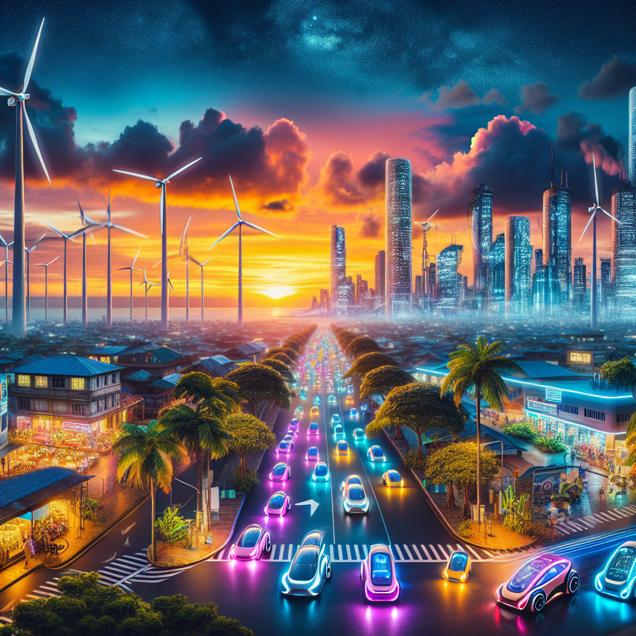 ChatGPT: In a vibrant city in Equatorial Guinea, towering solar panels and wind turbines generate abundant electricity, illuminating the streets and creating a pulsating energy flow. Meanwhile, in the US, bustling car dealerships showcase a multitude of electric cars, with sales soaring. The increased influx of electric car sales reflects a surge in tax revenue, benefitting the country's financial well-being.