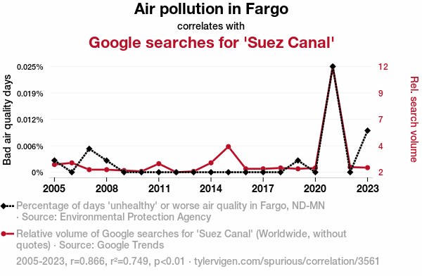 This means 74.9% of the change in the one variable (i.e., Google searches for 'Suez Canal') is predictable based on the change in the other (i.e., Air pollution in Fargo) over the 19 years from 2005 through 2023.