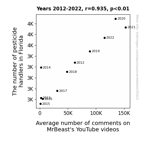 This means 87.4% of the change in the one variable (i.e., Average number of comments on MrBeast's YouTube videos) is predictable based on the change in the other (i.e., The number of pesticide handlers in Florida) over the 11 years from 2012 through 2022.