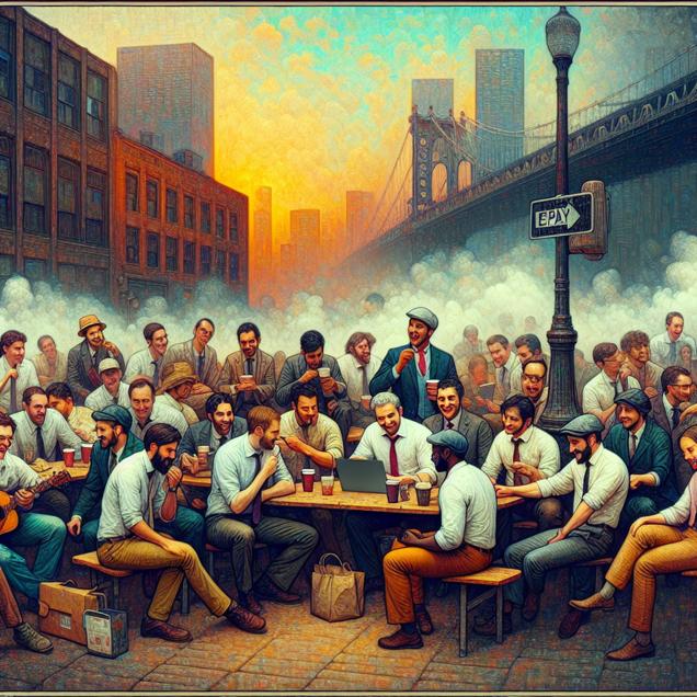 User prompt: Please respond with an image generation prompt that would be likely to create an interesting visual using DALLE-3, using the following style: [ Pop art ] and depicting this scene: In downtown Champaign, Illinois, a group of engineers sit outside a cafe, surrounded by smog and air pollution. They are reading and laughing at xkcd comics about engineering, using the hazy atmosphere as inspiration for their next big joke. Keep the visual depiction simple. Do not include any words or speech bubbles.
