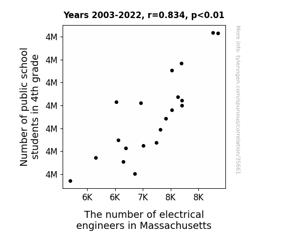 This means 69.6% of the change in the one variable (i.e., The number of electrical engineers in Massachusetts) is predictable based on the change in the other (i.e., Number of public school students in 4th grade) over the 20 years from 2003 through 2022.