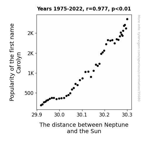 This means 95.5% of the change in the one variable (i.e., The distance between Neptune and the Sun) is predictable based on the change in the other (i.e., Popularity of the first name Carolyn) over the 48 years from 1975 through 2022.