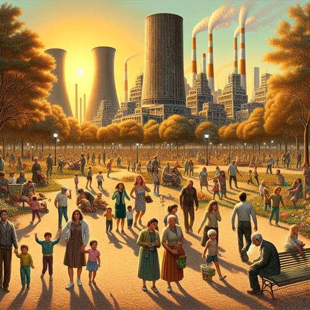 ChatGPT: Generate an image that captures the essence of an Argentinian city park filled with vibrant energy, where parents gather as their children, all named Sienna, play joyfully in the warm sunlight. Show a bustling atmosphere of activity, with the nearby power plant subtly reflecting the earthy hue of the biomass, connecting the increasing popularity of the name Sienna to the natural world. The scene should radiate a sense of organic harmony and abundant energy.