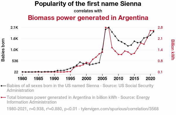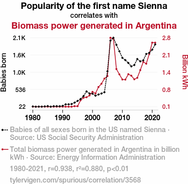 - The spurious research paper: The Sienna Sisters: Surprising Synergy between Name Popularity and Biomass in Argentina