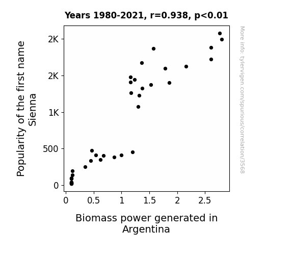By subjecting the data from 1980 to 2021 to rigorous statistical scrutiny, we unearthed a correlation coefficient of 0.9382847, with a p-value less than 0.01. These findings left our research team equal parts astounded and tickled pink, showcasing the whimsical bond between the popularity of Sienna and the production of biomass power in Argentina.