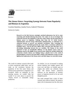 User prompt: Please provide potential search keywords for a paper titled The Sienna Sisters: Surprising Synergy between Name Popularity and Biomass in Argentina with an abstract of Research on the link between seemingly unrelated phenomena has led to some surprising and chuckle-inducing discoveries. Our study set out to investigate the connection between the popularity of the first name Sienna and the generation of biomass power in Argentina. Utilizing data from the US Social Security Administration and the Energy Information Administration, we embarked on a whimsical journey to uncover any potential correlations.