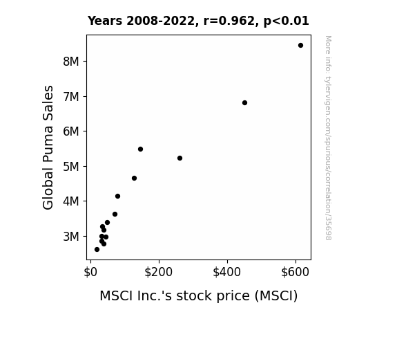 This means 92.6% of the change in the one variable (i.e., MSCI Inc.'s stock price (MSCI)) is predictable based on the change in the other (i.e., Global Puma Sales) over the 15 years from 2008 through 2022.