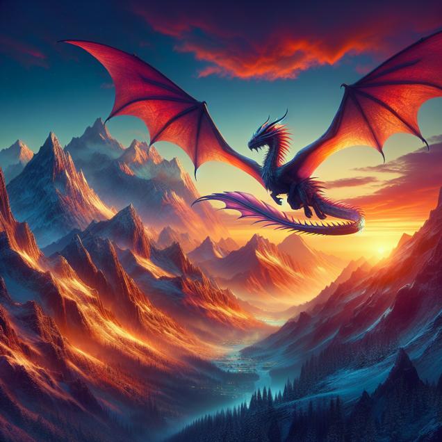 Prompt: [ A scene from Skyrim ] -- A majestic dragon soars through the icy peaks of the Throat of the World, its wings outstretched as it is bathed in the warm glow of the setting sun. The dragon's scales shimmer with a radiant light, reflecting the colors of the horizon as the sky transitions from vibrant oranges to deep purples. In the distance, snow-capped mountains stand stoically, their jagged peaks reaching towards the darkening skyline. The dragon's presence commands attention, evoking a sense of both wonder and trepidation as it navigates the twilight-drenched skies. The depiction should include only scenes, people, and objects, it should not include text or speech bubbles.