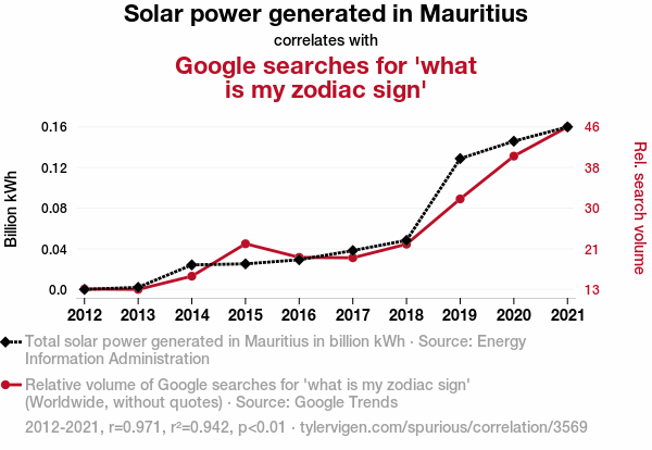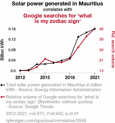 - The spurious research paper: Stargazing Solar: The Celestial Connection Between Solar Power Generation in Mauritius and Searches for 'What is My Zodiac Sign' on Google